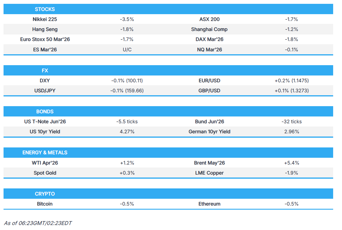 • US stocks were pressured as yields rose in response to further upside in oil prices following an Israeli attack on the South Pars gas facility, which is the largest in the world. Oil then gave back some of its gains as EU's Kallas and Iran's Foreign Minister spoke, but saw a late resurgence after Qatar announced the Ras Laffan Industrial complex was attacked, causing extensive damage, while Israel targeted Iranian navy ships in the Caspian Sea.